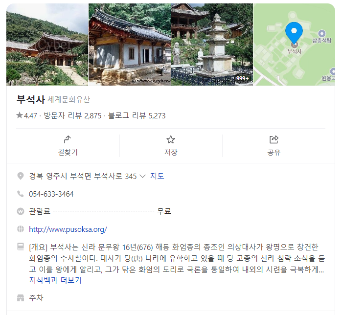 부석사는 입장료와 주차료가 무료입니다. 사찰 경내가 넓지는 않지만, 국보와 보물들을 찬찬히 둘러보고 소백산의 아름다운 풍경을 감상하며 여유롭게 시간을 보내기에 좋습니다. 특히 가을철에는 단풍과 은행나무가 어우러져 절경을 이룹니다.